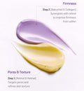 Voiteen keltainen osa sisältää retinolia (200 ppm) ja retinalia (1 ppm), jotka tukevat solujen uusiutumista, parantavat ihon kimmoisuutta ja vähentävät hienoja juonteita sekä epätasaista tekstuuria. Violetti osa puolestaan sisältää bakuchiolia (5,000 ppm) ja kollageenia, jotka vahvistavat ja napakoittavat ihoa samalla kun ne täydentävät retinolin vaikutuksia. Bakuchiol auttaa myös säätelemään talintuotantoa ja hoitamaan ihohuokosia, kun taas kollageeni tukee ihon joustavuutta ja kosteustasapainoa, jolloin iho näyttää elinvoimaiselta.